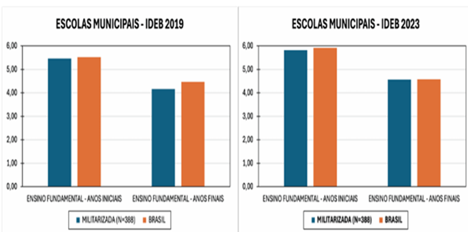 Em escolas estaduais o índice de crescimento do Ideb em relação a elas mesmas antes de serem militarizadas se mantiveram sem variações significativas. Já comparado o Ensino Médio com todas escolas nesta etapa no país também há números de crescimento equivalente, mesmo mais equipadas, com mais presença no Sul/Sudeste, e com mais investimentos. O crescimento nos quatro anos foi de apenas 0,2, enquanto da média do Brasil 0,1.