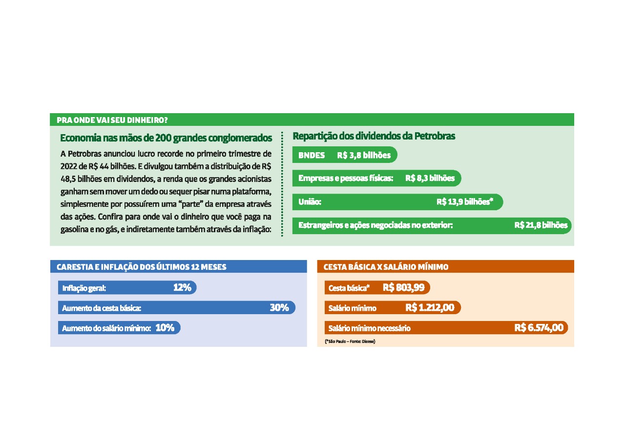 A Petrobras anunciou lucro recorde no primeiro trimestre de 2022 de R$ 44 bilhões. E divulgou também a distribuição de R$ 48,5 bilhões em dividendos, a renda que os grandes acionistas ganham sem mover um dedo ou sequer pisar numa plataforma, simplesmente por possuírem uma “parte” da empresa através das ações. Confira para onde vai o dinheiro que você paga na gasolina e no gás, e indiretamente também através da inflação: