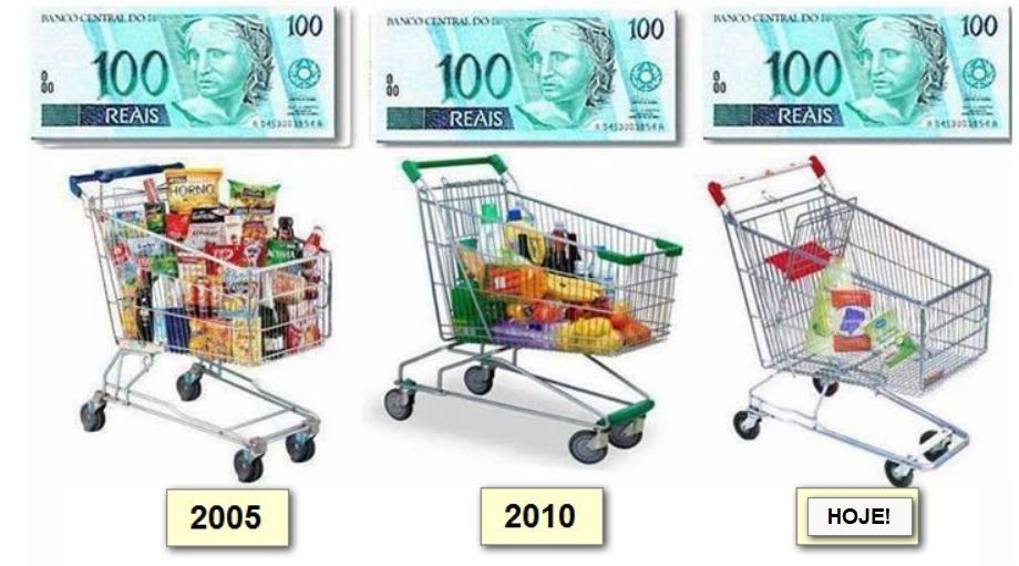 Um "meme" bastante difundido nas redes sociais mostra uma compra feita no supermercado com R$ 100,00 há dois anos e o carrinho com os mesmos R$ 100,00 hoje. Com esse valor atualmente, você pode simplesmente dispensar o carrinho e levar poucos produtos na mão.