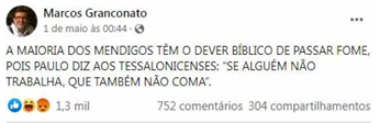 (...) Sim, a maioria são “vagabundos”. “Com base no que eu vejo nas ruas. Gente forte, saudável e jovem mendigando por aí! Quando vejo um doente, me compadeço. Mas quando olho para a maioria, percebo que é pura vagabundagem.É visível a falta de "amor cristão". Com certeza, negaria abrigo a José e Maria e jogaria pedra em Cristo, já que ele estava com ‘’ladrões’’.