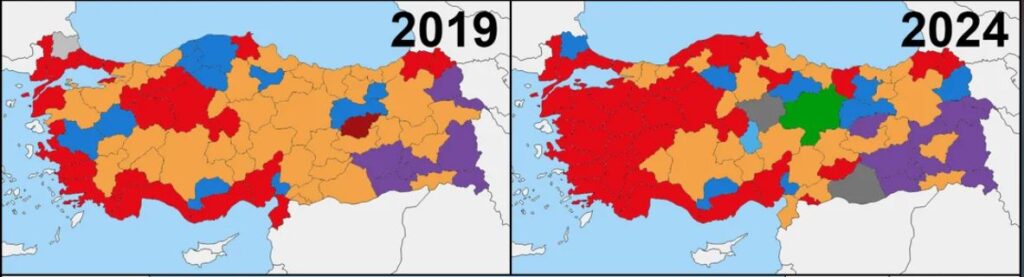 Nos mapas abaixo vemos quanto o AKP (laranja) perdeu terreno tanto para o CHP (vermelho) quanto para o HDP (Halkların Demokratik Partisi ) Partido Democrático do Povo (roxo), centrado na representação do povo curdo, nas últimas eleições locais: