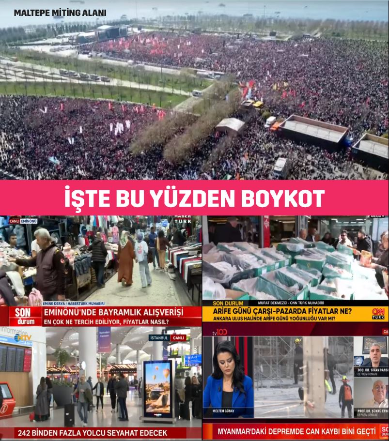 A tática adotada pelo CHP a partir de 23 de março é a de exigir antecipação da eleição presidencial marcada para 2028, ao mesmo tempo que se choca abertamente com os setores burgueses que, de alguma forma, contribuem com o regime ou tenham silenciado sobre a atual situação. O chamado a um boicote de diversas marcas, incluindo grandes conglomerados midiáticos, surtiu efeito imediato. No mesmo dia do anunciado boicote, alguns canais de TV controlados por afiliados de Erdoğan passaram a mostrar os protestos e noticiar os comícios do CHP em frente à prefeitura de Istambul. Como a greve e as paralisações da produção e circulação são a arma mais poderosa da nossa classe contra os patrões, este boicote deixou claro que, quando o bolso é tocado, é preciso negociar imediatamente!