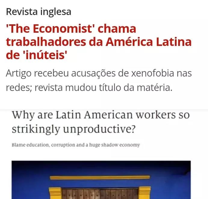 O portal de uma das principais revistas do Reino Unido foi obrigado a substituir o título de uma matéria em que abordava a produtividade dos trabalhadores e trabalhadoras latino-americanos, na última sexta-feira, dia 9. O título, agora, é "Por que os trabalhadores latino-americanos são tão notavelmente improdutivos?". E, por mais absurdo que já seja, foi colocado para substituir o original, ainda mais asqueroso ("Uma terra de trabalhadores inúteis"), depois de uma onda de protestos e indignação nas redes sociais.