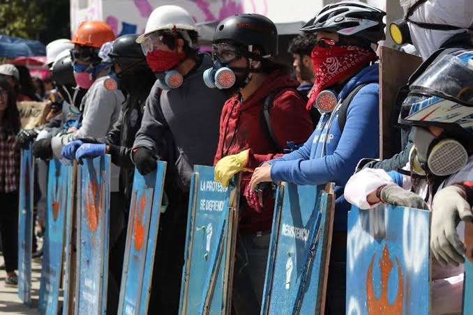 Manifestantes em Bogotá, Colômbia, Dezembro de 2019. Grupo que se autodesignou "Primeira Linha" para defender os atos durante a greve geral.