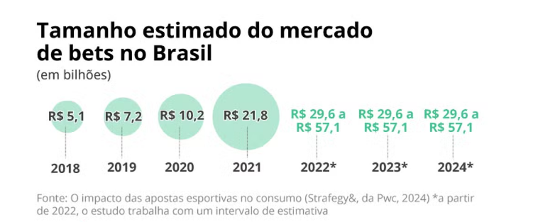 Levantamento da auditoria britânica PwC estima que somente no Brasil, em 2023, o mercado de apostas movimentou entre R$ 60 bilhões e R$ 100 bilhões. E para ser uma ideia da quantidade de dinheiro que gira no mundo das “bets”, vale destacar que, em 2018, quando a atividade foi legalizada, foram “apenas” R$ 5,1 bilhões e estima-se que, agora, em 2024, a movimentação gire entre R$ 90 bilhões e R$ 130 bilhões.