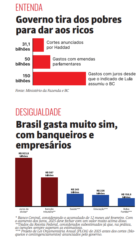 Vejamos um exemplo. Os R$ 10 bilhões que o governo arrecadaria com o aumento do IOF não seriam para construir hospitais ou escolas, mas para fazer superávit primário, ou seja, para o pagamento de juros da dívida aos banqueiros. O patrimônio dos bilionários continua intocado, enquanto os pobres permanecem pagando a conta do ajuste fiscal. Portanto, é falsa essa disjuntiva: temos que aumentar o IOF para não cortar o salário mínimo ou o dinheiro da Educação. Dentro do arcabouço fiscal, o salário mínimo, assim como a Saúde, a Educação e todas as áreas sociais, está sendo solapado e continuará sendo atacado, com ou sem IOF.