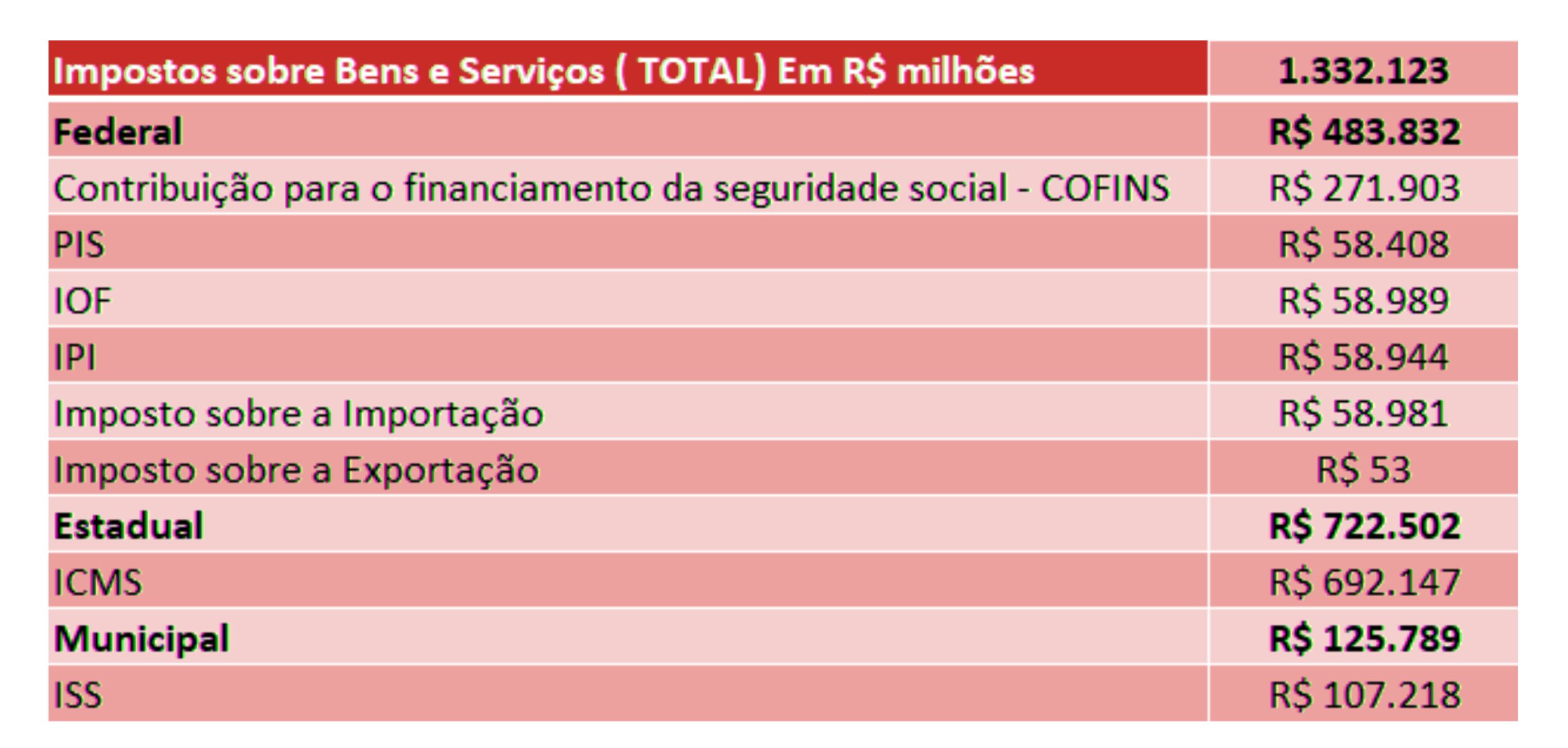Considerando os três tipos de tributos (consumo, propriedade e renda/lucro), os impostos sobre o consumo de bens e serviços são, de longe, o principal componente dos tributos no Brasil.