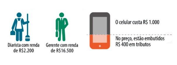 Quando uma diarista ou um gerente compram um celular, por exemplo, eles pagam algo como R$ 400 só em impostos. O que é importante destacar é que este pagamento é considerado "regressivo", pois a diarista, que ganha menos, paga mais, proporcionalmente à sua renda, do que é pago pelo gerente.