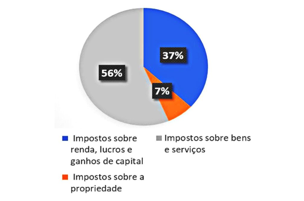 Desconsiderando apenas as contribuições sociais, como FGTS e Previdência, os impostos sobre bens e serviços são os que mais arrecadam no país, sendo responsáveis por 56% da arrecadação em 2022 (veja o gráfico). Já os impostos sobre a propriedade corresponderam a apenas 7%, e os impostos sobre a renda, lucros e ganho de capital representaram 37% da arrecadação.
