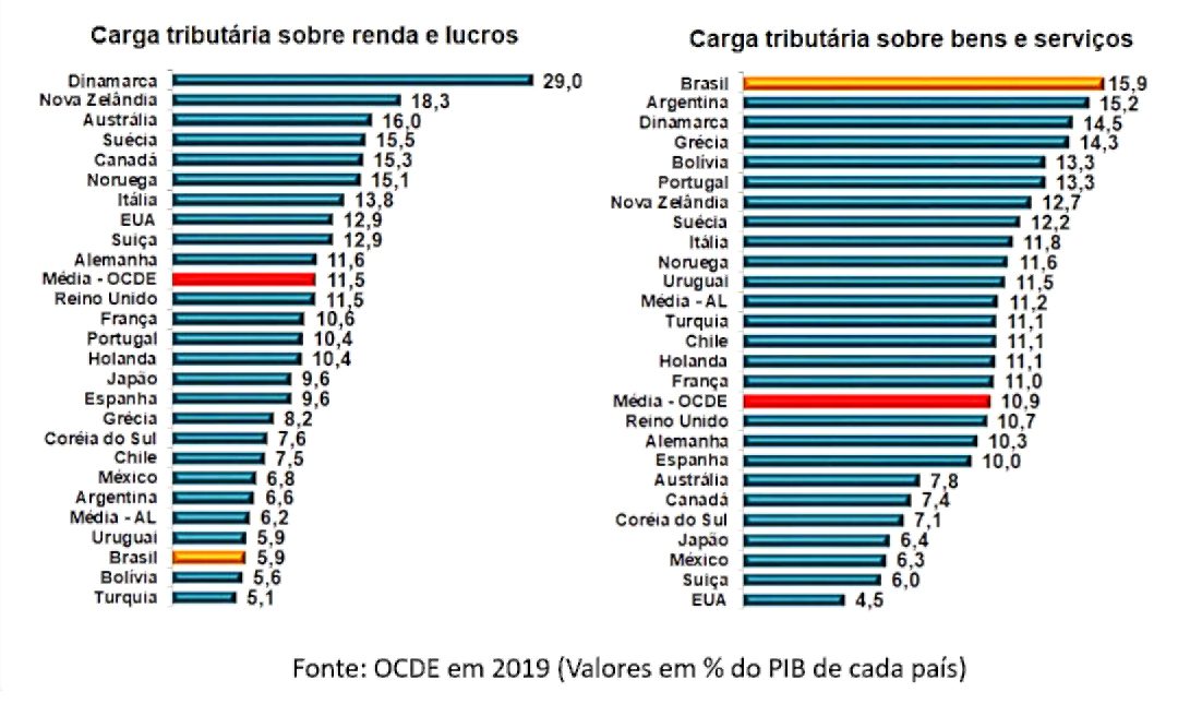 Em suma, o Brasil é líder na tributação de impostos sobre bens e serviços, sendo que, em 2019, os valores arrecados representaram 15,9% do Produto Interno Bruto (PIB), bem acima da média da OCDE (10,9%). Já no quesito imposto sobre a renda e lucros, a arrecadação no Brasil atinge 5,9% do PIB, ficando bem abaixo da média da OCDE, que é 11,5% do PIB.