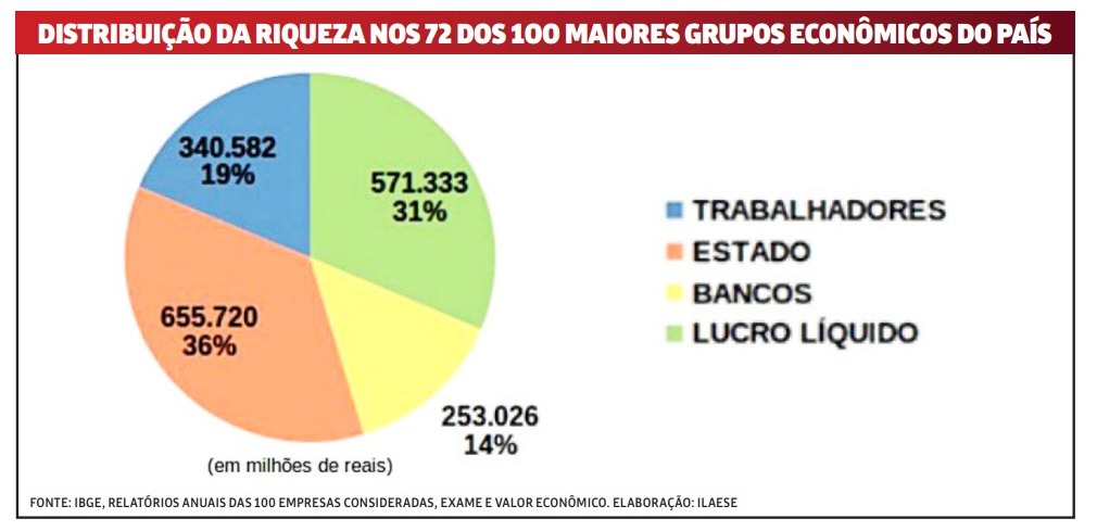 Um estudo realizado por Gustavo Machado do Ilaese (Instituto Latino Americano de Estudos Socioeconômicos) mostra que, no Brasil, considerando as 72 maiores empresas, no ano de 2021, os salários dos trabalhadores eram equivalentes a dois meses e sete dias de trabalho. Os demais dias do ano foram "trabalho de graça" para o patrão, para os bancos e para o Estado, na forma de impostos (veja o gráfico).