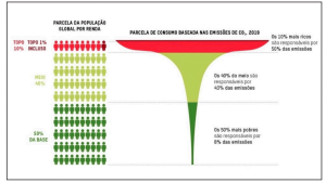 → Segundo a Oxfam, em 2019, o 1% mais rico foi responsável pela mesma emissão de carbono que os 66% mais pobres no mundo, ou seja, 5 bilhões de pessoas. → As emissões de carbono do 1% mais rico cancelam o benefício gerado por 1 milhão de turbinas de vento. → Super-ricos são responsáveis por 16% de todas as emissões de carbono do planeta desde 1990.