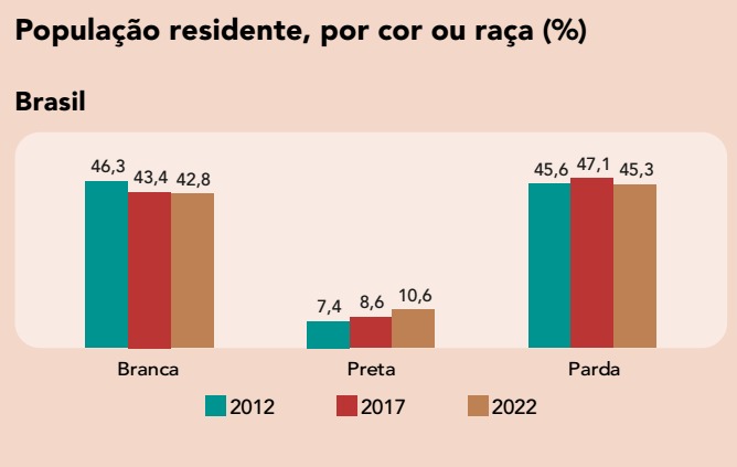Dados divulgados na sexta-feira, dia 16, pela Divisão de Características Gerais dos Domicílios e dos Moradores/2022, na Pesquisa Nacional por Amostra de Domicílios (PNAD) Contínua, do Instituto Brasileiro de Geografia e Estatística (IBGE), revelaram que o índice de pessoas que se identificam como "pretas" teve o maior aumento dentre os grupos raciais na última década, subindo de 7,4% (em 2012) para 10,6%, totalizando, assim, cerca de 22,7 milhões de nossos 214,3 milhões de habitantes.