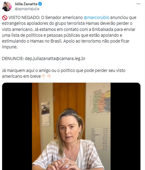 Na mesma mensagem, Gayer também afirmava que acabava "de encaminhar um ofício para a Embaixada dos Estados Unidos no Brasil informando, às autoridades competentes uma lista de políticos, entidades e civis brasileiros que, publicamente, já manifestaram apoio ao grujpo terrorista Hamas". A lista aparece numa imagem timbrada com a logo da Câmara dos Deputados, e "Gabinete do Deputado Federal Gustavo Gayer". Entre os nomes "denunciados", além de uma série de deputados, partidos e organizações, está a da ativista pró-palestina e militante do PSTU, Soraya Misleh.