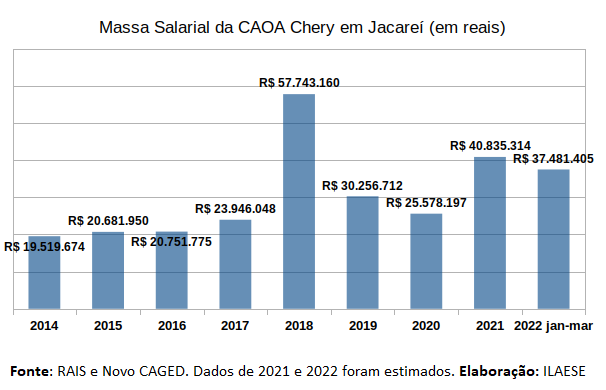 Apenas em Jacareí essa massa salarial associada diretamente a Chery e ao setor de autopeças é de R$ 53 milhões de reais anuais (gráfico abaixo), podendo abarcar outros R$ 45 milhões de reais nas demais cidades da região que atuam como fornecedores da Chery.