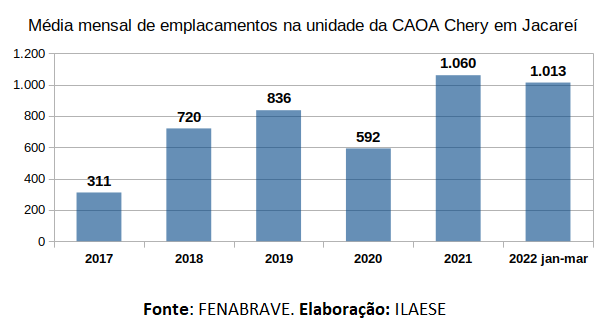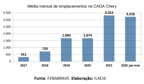 Em 2017, o Grupo Caoa compra 50,7% das operações da chinesa Chery. Isso levou a um salto expressivo nas vendas entre 2017 e 2019 e, também em 2021. Em 2022, temos a manutenção dos mesmos índices, como pode ser notado na quantidade média mensal de emplacamentos, conforme gráfico abaixo: