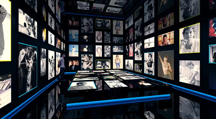 Em outro ambiente, repleto de fotografias do chão ao teto, imagens animadas por IA cantam trechos de hits como “Brasil” e “Codinome Beija-flor”.