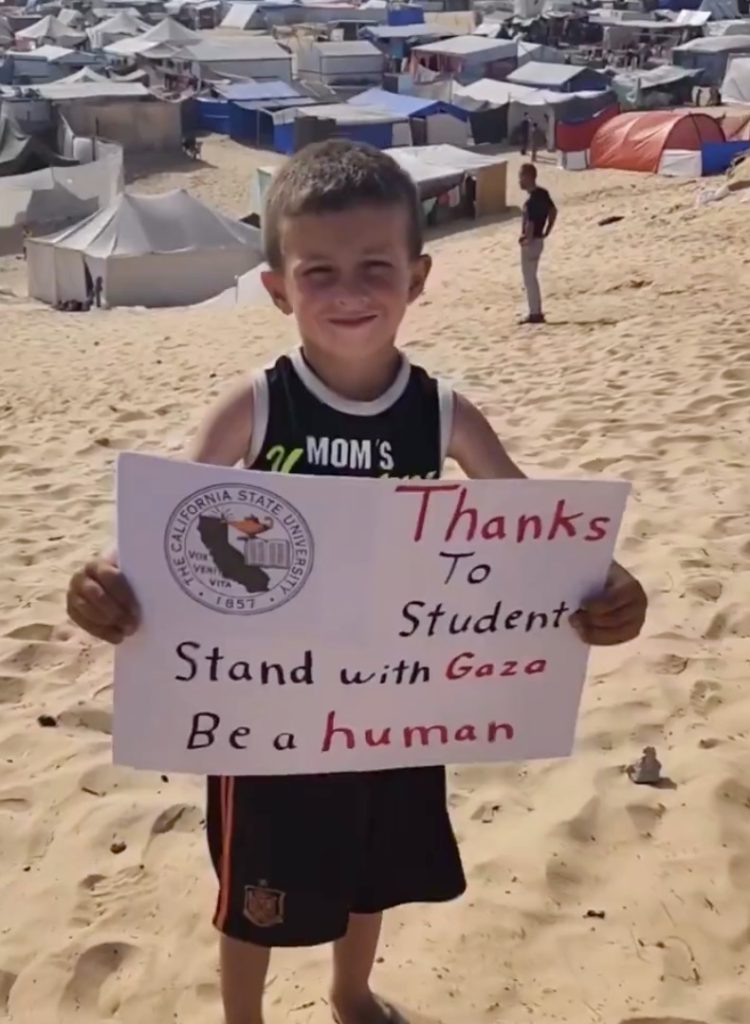 Palestinos de Gaza também encontraram uma outra maneira de dar visibilidade a este sentimento em meio aos deslocamentos e escombros. Obrigados a viver em acampamentos, expulsos de seus bairros, campos de refugiados e locais, empurrados cada vez mais para Rafat, no sul de Gaza, muitos escreveram em suas tendas: “Obrigado, estudantes!”, “De Rafat, enviamos-lhes força!” ou, ainda, “As crianças de Gaza estão orgulhosas de vocês!”