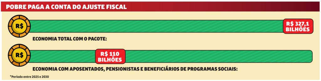 Só no próximo ano, o governo espera economizar R$ 2 bilhões com esse ataque ao salário mínimo. Só das aposentadorias, pensões, e benefícios sociais, o governo espera tirar R$ 109 bilhões, entre 2025 e 2030. Isso é um terço dos R$ 327,1 bilhões que o pacote pretende economizar neste período.