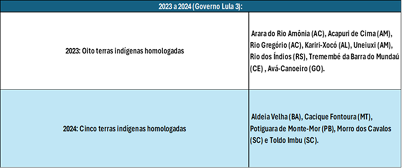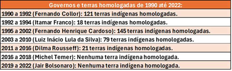 Apesar de Lula, no período eleitoral, se dizer aliado dos povos indígenas e se colocar a favor da demarcação de terras e dos direitos dos povos originários, como presidente de fato nem sequer toca no assunto. Não é a toa que a demarcação de territórios indígenas estagnou no Brasil. No atual governo, sequer o número de terras homologadas chegou aos níveis das décadas de 1990 como podemos ver a seguir: