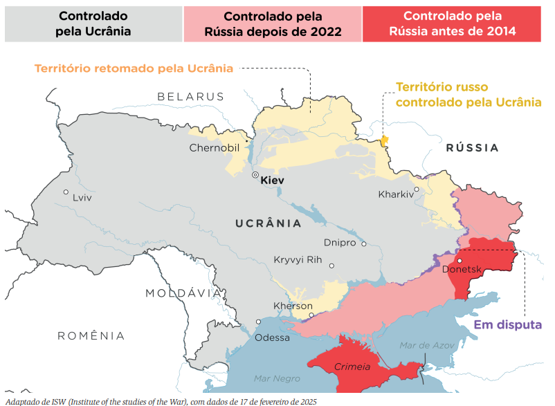 O novo governo Trump alterou a posição dos Estados Unidos, aproximando-os dos interesses russos na Ucrânia. As cenas do presidente ucraniano, Volodymyr Zelensky, sendo humilhado na Casa Branca, bem como as exigências para que ele aceite anexações territoriais e sujeite a Ucrânia à pressão russa, são a prova inequívoca dessa mudança. Trump suspendeu a ajuda financeira ao país como forma de pressão para que os termos russos, que preveem uma paz com anexações, sejam aceitos. Em paralelo, exige-se que Zelensky firme um acordo para a entrega das terras raras ucranianas às multinacionais estadunidenses.