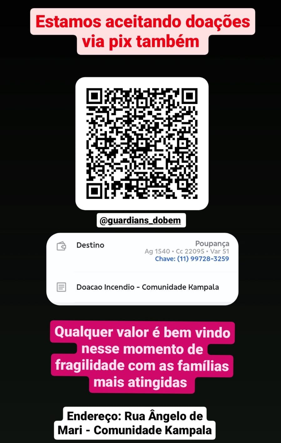 Mais um incêndio, mais uma tragédia se abate sobre a vida dos mais pobres. Dessa vez os atingidos são os moradores da Kampala, uma ocupação situada na Penha, Zona Leste de São Paulo. Neste momento, as famílias precisam urgentemente de ajuda. A Associação dos Moradores Kampala Para Todos e as Guardiãs do Bem, ONG que atua na comunidade, está fazendo uma campanha para arrecadar alimentos, roupas, lençóis (está muito frio) e o que mais puder confortar adultos, idosos e crianças atingidas.