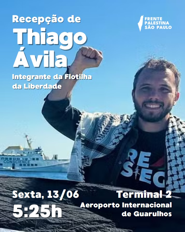 A libertação de Thiago Ávila é uma vitória da solidariedade internacionalista e das mobilizações que estão ocorrendo pelo mundo. É nosso dever ampliar as mobilizações, as ações de ruas em apoio à resistência do povo palestino e pela liberdade para os demais ativistas ainda detidos em Israel.