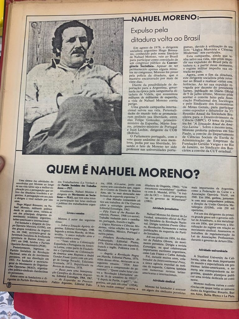 Em agosto de 1978, o dirigente socialista argentino Hugo Bressano, conhecido como Nahuel Moreno, veio ao Brasil para participar como convidado de um congresso público da Convergência Socialista. Apesar de ter permanecido apenas alguns minutos no congresso, Moreno foi preso pela polícia da ditadura, que o manteve encarcerado por mais de 20 dias.