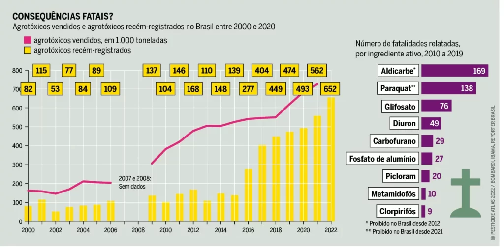 O resultado é a explosão dos casos contaminação. Entre janeiro de 2013 e junho de 2022, foram notificados 124.295 casos de intoxicação por agrotóxicos. Um levantamento da Agência Pública e do Portal Repórter Brasil, com dados de 2019 a março de 2022, apontou que essas intoxicações resultaram em 439 mortes. Mas, especialistas alertam que o número pode ser bem maior, pois ainda há muita subnotificação.