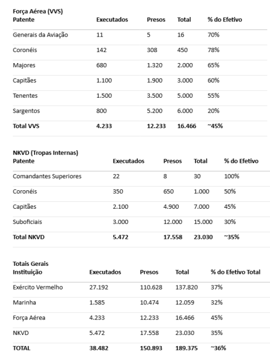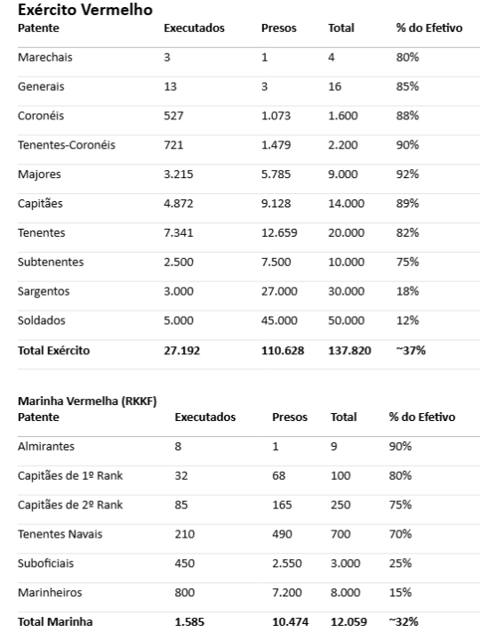 Todas as forças de defesa e inteligência foram dizimadas, desde os altos escalões – onde se debatiam as políticas estratégicas e se formularam as doutrinas – até os escalões inferiores. A moral e a disciplina foram destroçadas. Os novos oficiais jamais poderiam substituir a experiência e adestramento dos antigos, muitos dos quais com prática na guerra civil e treinados por mais de uma década nas academias militares. Segundo comunicado enviado a Stálin em 1939, 85% dos novos comandantes de todos os níveis tinham menos de 35 anos, ou seja, sem a devida formação e experiência em combate.