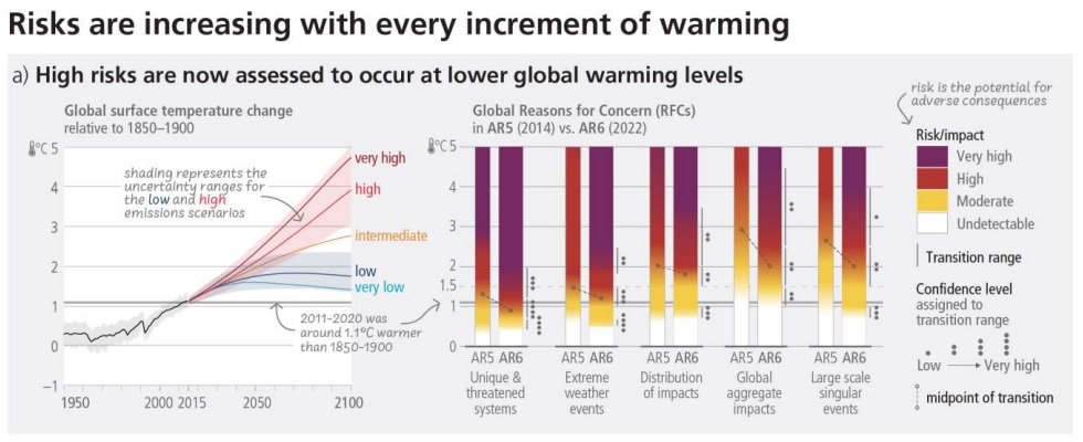 Os riscos estão aumentando a cada incremento do aquecimento. Fonte: IPCC.