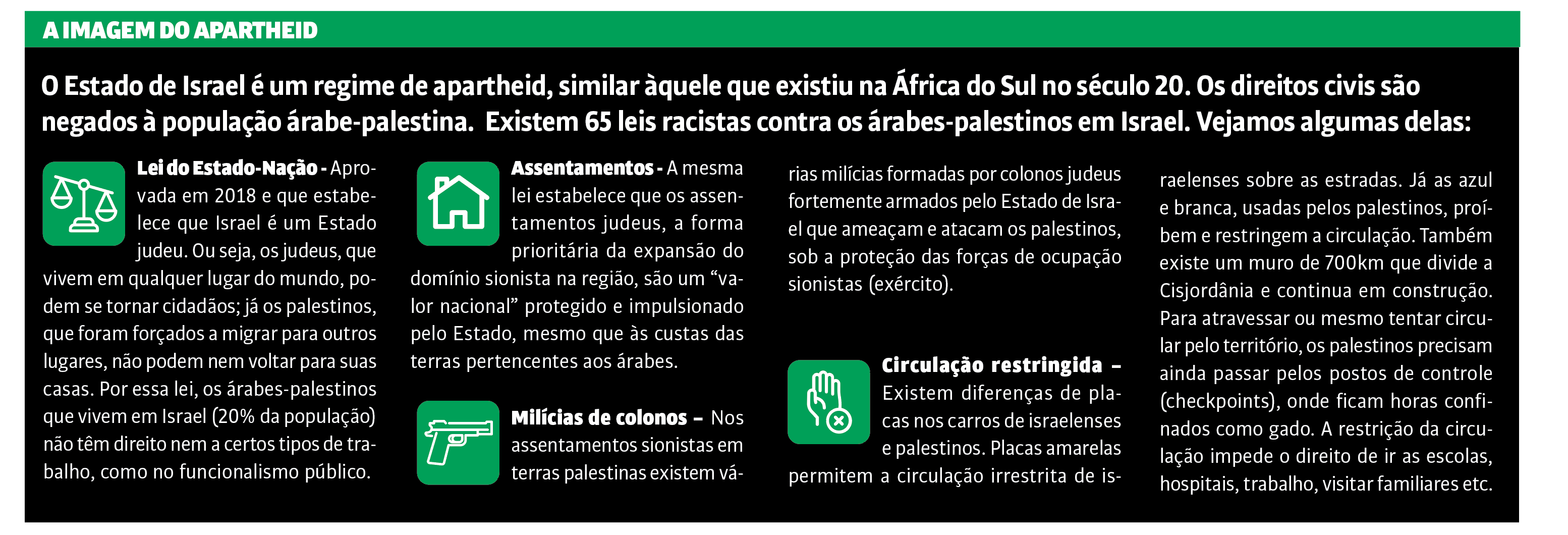 A realidade cotidiana dos palestinos e palestinas é violação de todos os direitos humanos fundamentais pelas forças de ocupação, regime de apartheid, expansão colonial agressiva via racismo, limpeza étnica, genocídio.