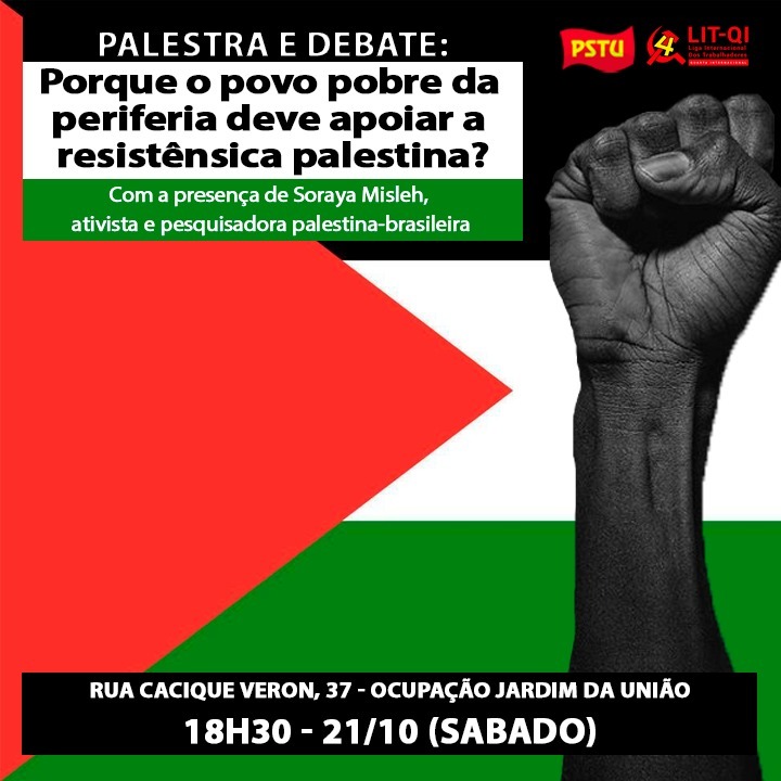 18h30 – São Paulo (SP): Palestra e debate “Por que o povo pobre da periferia deve apoiar a resistência palestina?”, com Soraya Misleh, na Ocupação Jardim União (R. Cacique Veron, 37).