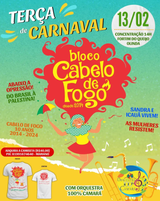 As ladeiras de Olinda, cidade histórica de Pernambuco, serão ocupadas pelos foliões do bloco ‘Cabelo de Fogo’, que há 10 anos desfila na terça-feira de Carnaval. Este ano, o cortejo, que será acompanhado pela Orquestra 100% Camará, traz como tema a luta contra as opressões do Brasil até a Palestina. A concentração será a partir das 14h, no Fortim do Queijo (Rua Manoel Borba, no bairro Carmo).