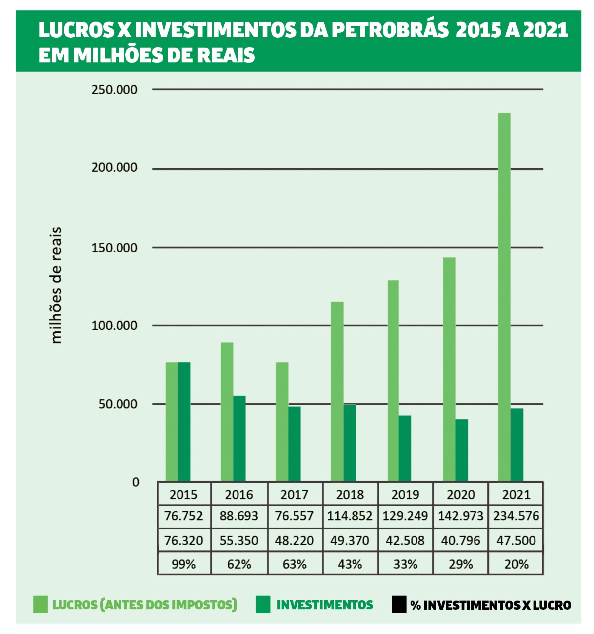 Este fenômeno gerou uma contradição na Petrobras: quanto mais ela gera riquezas, menos investe em si mesma e no país, como fica evidente no gráfico.