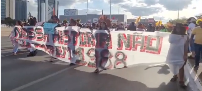 No Distrito Federal, manifestantes se reuniram em frente a Biblioteca Nacional de Brasília e saíram em caminhada até o Congresso Nacional, com faixas e cartazes contra o PL 490.