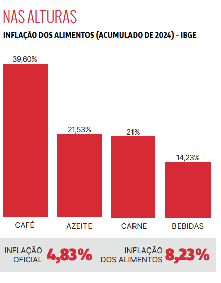Ir ao supermercado vem se tornando um fardo cada vez maior para as famílias trabalhadoras. O café se tornou o símbolo dessa escalada de preços. Seu preço nas gôndolas do supermercado aumentou 39,6% no ano passado. Viralizaram os "cafés fakes", galhos e folhas de restos da produção de café, embalados e postos à venda como "bebida à base de café". Já a carne acumula uma alta de mais de 20%. Nem o ovo escapa, aumentando 40% só na segunda quinzena de janeiro.