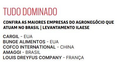 Isso significa que um conjunto de bilionários domina a produção agropecuária brasileira, atendendo a demanda do mercado internacional e os preços definidos em Chicago. Preços esses determinados por banqueiros e investidores que também lucram especulando com as commodities. Ou seja, não produzem para atender as necessidades da população, mas para atender o mercado e os capitalistas. A cotação em dólar do café e da carne subiram na bolsa? Bom para eles que lucrarão mais, ruim para você que vai pagar mais no mercado.