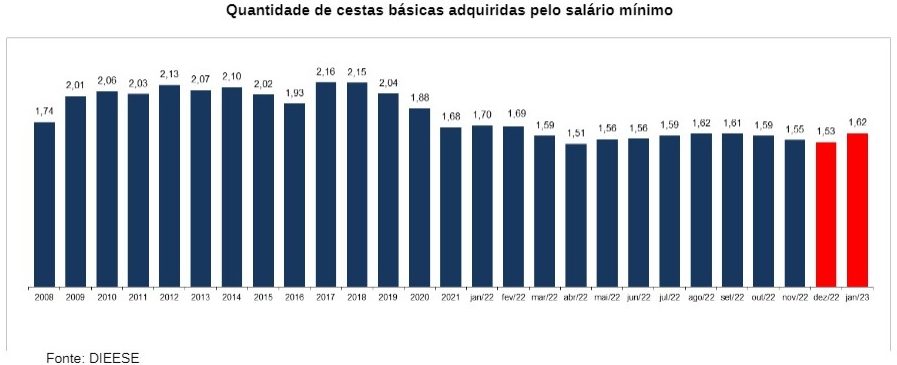 Para se ter uma ideia, levantamento do Dieese aponta que o atual salário mínimo compra menos que duas cestas básicas. Mais precisamente, em janeiro equivalia a 1,62 cesta básica. É menos do que comprava em janeiro do ano passado, 1,70 cesta, ou em toda a década passada. Na verdade, essa relação só não é menor que em 2005, mostrando o grau de empobrecimento e de desvalorização real do salário mínimo na vida concreta das famílias trabalhadoras.