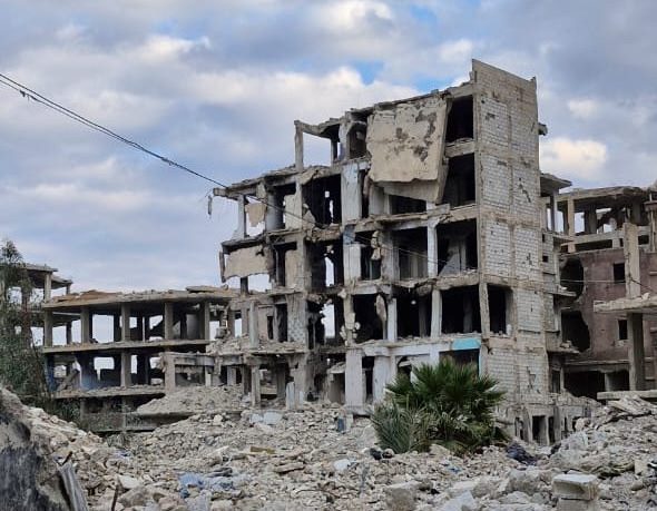O campo foi arrasado por bombardeios aéreos feitos pelo ditador Assad. Passamos em frente a dois hospitais que estão no chão, destruídos, e também mesquitas, uma delas onde ocorreu o primeiro grande massacre quando o ditador Assad bombardeou a Mesquita na sexta-feira quando a movimentação de pessoas era maior.