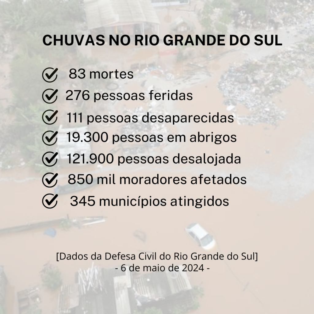 Em boletim divulgado hoje (6/5), a Defesa Civil do Rio Grande do Sul contabiliza 83 mortes em razão dos temporais que atingem o estado. São investigadas outras 4 mortes. Além disso, há 111 desaparecidos e 276 pessoas feridas.