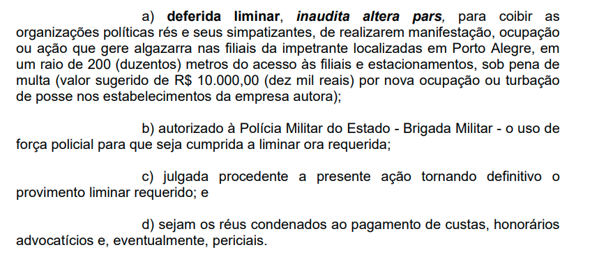 E agora, o grupo quer impedir que se realizem manifestações denunciando suas atrocidades cometidas pela ganância do lucro. Pedem, na Justiça, que não possamos nos aproximar a menos de 200 metros de qualquer loja do Zaffari, sob pena de multa de R$10 mil. Chamam de “ocupações” atos relâmpagos realizados na entrada dos mercados.