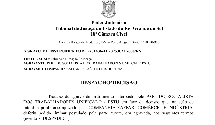 A liminar que proibia manifestações a menos de 100 metros das unidades do Zaffari acaba de ser suspensa pelo Tribunal de Justiça do Rio Grande do Sul (TJ/RS), através de recurso interposto pelo PSTU.