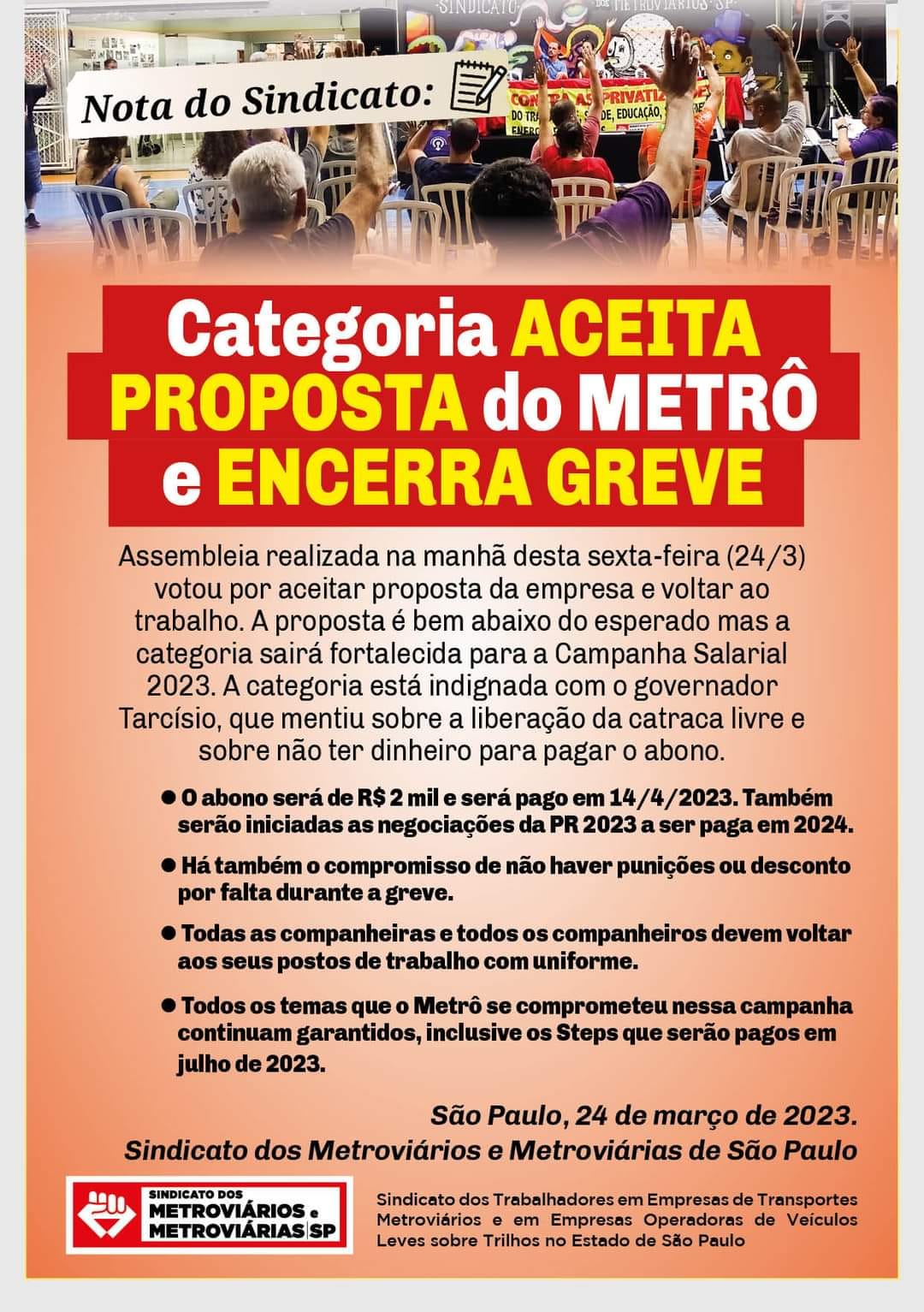 Foi apresentada a proposta de abono no valor de R$ 2 mil, abertura de negociação sobre a PR (Participação nos Resultados) de 2023 e nenhuma retaliação aos grevistas. Essa proposta levada à assembleia da categoria que aconteceu hoje, pela manhã. Por maioria, a categoria aprovou a proposta, que só saiu por conta da greve. O metrô estava intransigente.