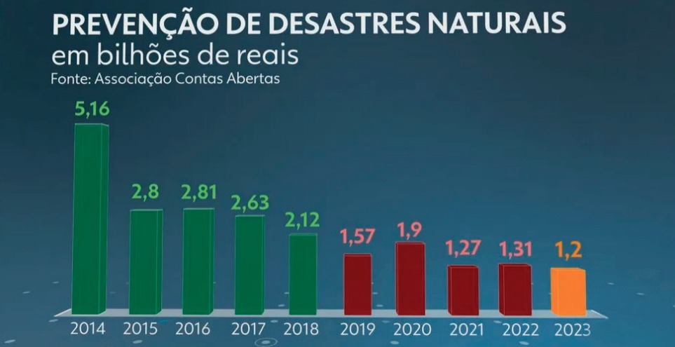 Em 2023, foi disponibilizado R$ 1,77 bilhão para o enfrentamento a tragédias deste tipo, segundo levantamento da ONG Contas Abertas. Para efeito de comparação, em 2013 eram R$ 11,6 bilhões, em valores atualizados. Em 2014, esse valor caiu para R$ 7,2 bilhões; em 2015, para R$ 4,4 bi; e, assim, sucessivamente.