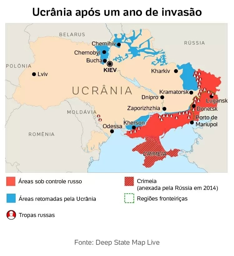 A segunda derrota militar de Putin veio em 10 de setembro quando as tropas russas tiveram que fugir da região de Kharkiv. Em novembro, a terceira derrota russa na importante cidade de Kherson, no sul do país. Desde então prevalece uma situação de impasse, com tropas russas ocupando 15% do território ucraniano.