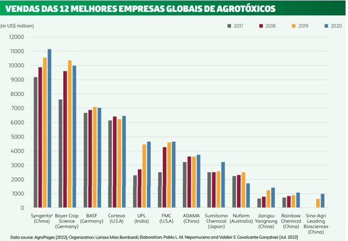 Entre os agrotóxicos liberados estão produtos conhecidos por causarem câncer, tal como o S-Metolacloro e o Glifosato. Todos eles são produzidos por um punhado de empresas imperialistas que lucram milhões produzindo veneno (veja gráfico ao lado).